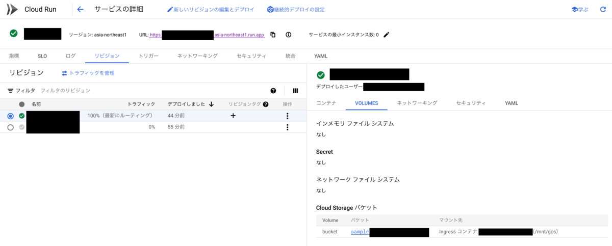 Cloud Console上でCloudRunのリビジョンからVOLUMESを確認すると、確かにCloud Storageバケットにマウント先が設定されていました。